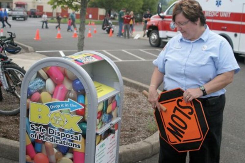 The U.S. Postal Service donated a damaged mailbox to the department, said Community Services Specialist Gina Riley. Sweet Home Public Works repaired it, Oregon Powder painted it, and Xtreme Graphics of Albany provided graphics of prescription drugs to cover the mailbox.