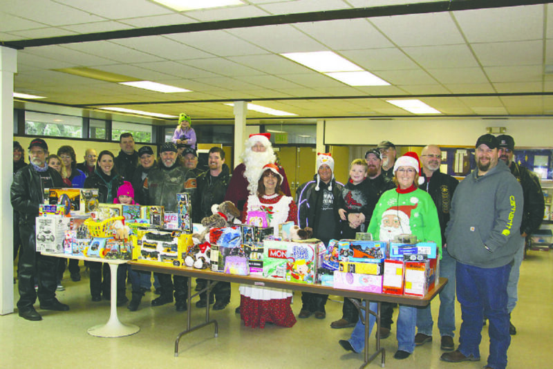 Santa (Randy Claasen) gets to ride in style during the STAR Touring and Riding Association’s second annual toy drive sponsored by Willamette Chapter 306 and the Sweet Home Choppers , hosted by the Sweet Home Elks Lodge Sunday afternoon, Dec. 18. Bikers and some assistants in trucks hauled toys from Bi-Mart to the Elks Lodge, where, above, they unloaded the toys and stacked them, below, in the lodge for distribution to local needy families. They also got a chili-and-cornbread lunch, courtesy of the Elks.