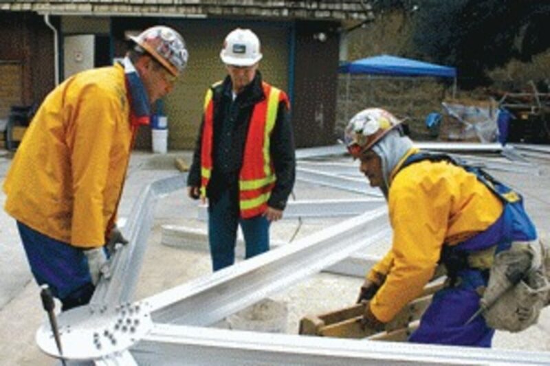 On Sunday, Temcor employees delivered the components of an aluminum dome that will cover the wastewater treatment plant’s sludge basin, which is the source of odor problems arising from the plant. Monday, they started constructing the frame for the dome on the ground near the basin.