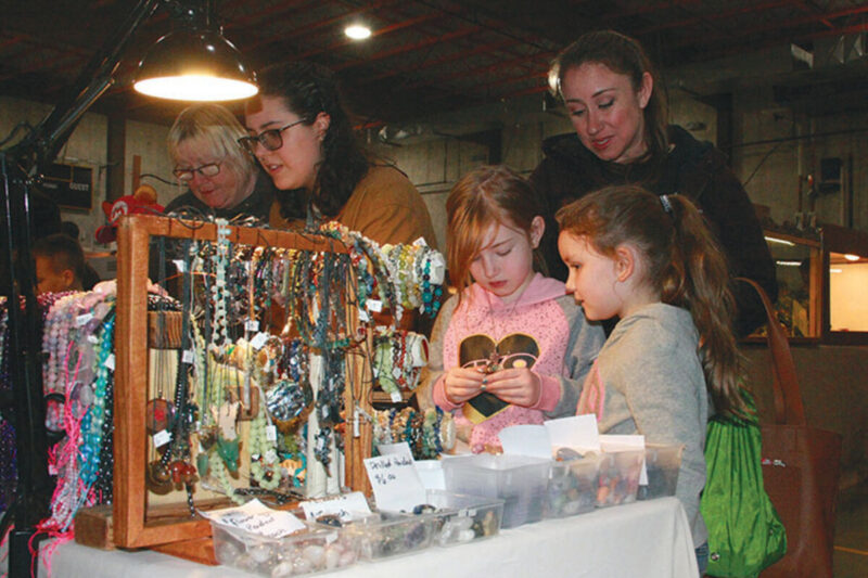 Seven-year-olds Elly Manley, left, and Raelee Hindman check out rocks from Lebanon’s Rock Castle and Cota’s Lapidary with Miranda Manley at the 73rd annual Sweet Home Rock and Mineral Show at the Sweet Home High School activity gym on April 1.