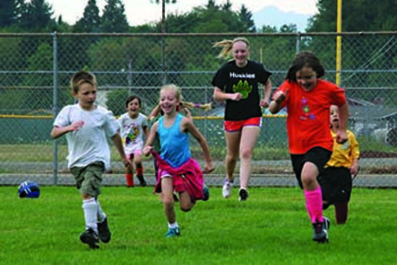 Young participants in Sweet Home High School’s annual summer soccer camp sprint across the field last week during one of the camp sessions. The camp mixed high school players, who helped local coaches with drills and soccer skill instruction for the younger children.