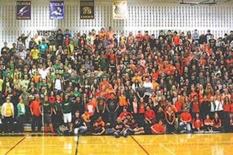 Students and staff members at Sweet Home High School display the colors of Umpqua Community College (green, white and yellow) and Roseburg High School (orange and black) Wednesday during a group photo to show support for their peers at those schools following the shootings at UCC. The event was organized by teachers and leadership students.