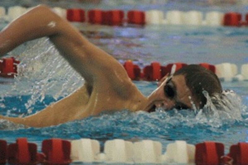 Jayce Calhoon, above, swims to a new state record and his second straight state title in the 500 freestyle at the OSAA 4A swimming championships Saturday at Mt. Hood Community College. The boys team placed second in the state behind Calhoon’s two victories, the other coming in the 100 backstroke.