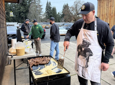 Above, crew members from the Halsey-Shedd Fire District flip burgers and hot dogs over a barbecue flame while…