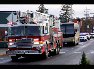 Sweet Home Fire’s ladder truck and police units escort the Sweet Home High School football team’s bus out…