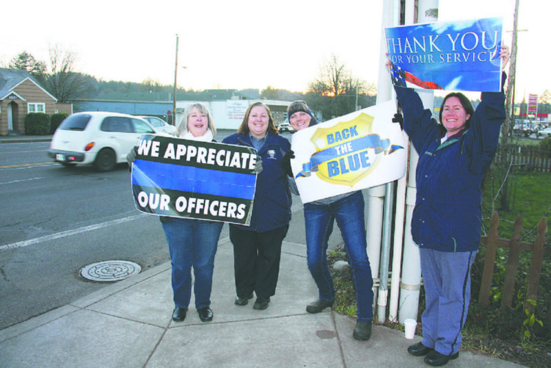 Drivers honk at local residents, joined by Community Services Officer Gina Riley, second from left, who gathered Friday afternoon at the Sweet Home Police Department in early recognition of Law Enforcement Appreciation Day, which was Monday. With signs, from left, are Connie Conner, Shannon Strubhar and Angela Miller.