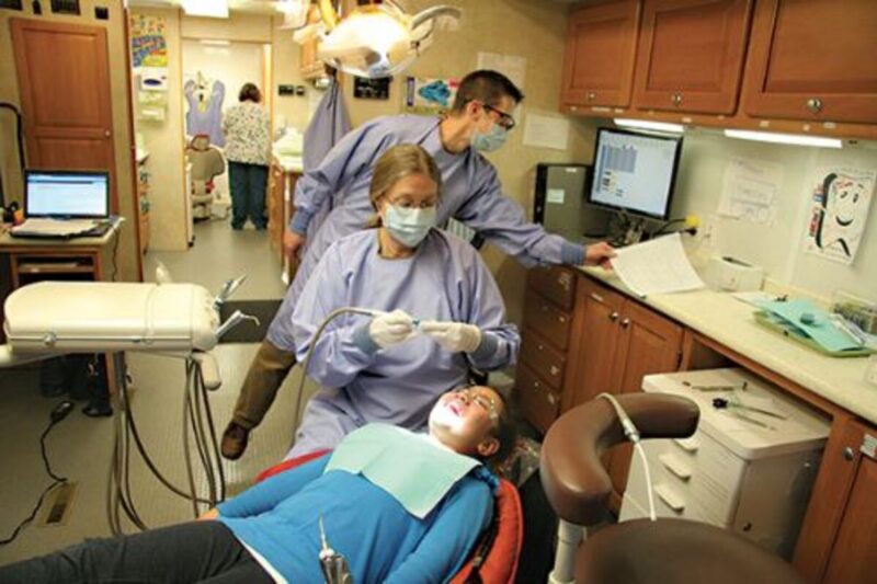 Dental Assistant Catherine Johnson gets set to clean Oak heights third-grader Moriah Winn’s teeth during a visit from the Tooth Taxi mobile dental clinic at the school last week to provide care for students from around Sweet Home. In the rear, dentist Dr. Dave Carneiro checks records after examining Moriah’s teeth. The Tooth Taxi is an outreach of the Dental Foundation of Oregon, he charitable arm of the Oregon Dental Association. Dentists and their staff members volunteer in the converted recreational vehicle, which visits schools around the state. As of this fall, the Tooth Taxi has has served over 14,000 children and delivered over $4 million in donated dental care, according to the DFO.