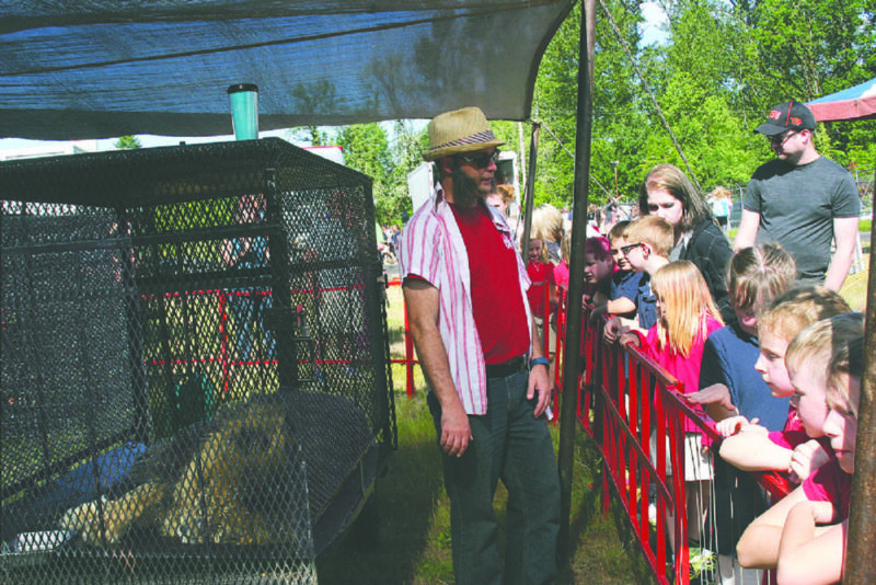 Leo Acton the clown sells coloring books to audience members during the Culpepper & Merriweather Circus Monday night, May 22, at the future site of Sweet Home City Hall. The circus performed two shows in Sweet Home.
