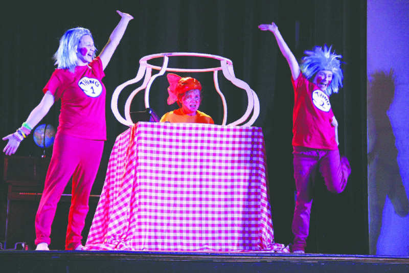 Alyssa “Al” Hartley-Davis portrays a plain-bellied sneetch celebrating the shiny new star on her belly during a presentation of “The Sneetches” by Dr. Seuss Thursday evening at Sweet Home High School’s spring play. At left, from left Thing 1 (Rebekah Woody) and Thing 2 (Alyssa “Al” Hartley-Davis), goof around with the Fish (Sophia Brown) during a performance of “The Cat in the Hat.” Below, Director Kylie Johnson reads “One Fish, Two Fish, Red Fish, Blue Fish” to children attending “A Night with Dr. Seuss.” High school drama students performed three Dr. Seuss stories Thursday and Friday. The third story was “The Zax.”