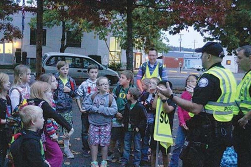 School Resource Officer Geoff Hamlin, above right, and Police Chief Jeff Lynn, far right, speak to a group of Oak Heights School students who participated in a National Walk and Bike to School event Wednesday morning, Oct. 7. At right, a “walking school bus” group of students and adults follow Oak Heights Principal Courtney Murphy, in orange, down Evergreen Lane. Students met at City Hall, Elm Street Baptist Church and Hillside Fellowship on Strawberry Loop to walk to Oak Heights, which has been working to develop a Safe Routes to School “action plan” to create safe, convenient and fun opportunities for children to bicycle and walk to and from schools, which 50 percent of students did in 1969; now it is 15 percent.