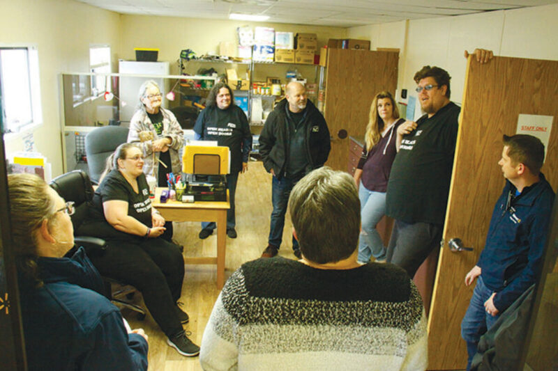 Addam Z. Reel, at right in the first photo, who was formerly homeless and is now a staffer at the Family Assistance and Resource Center’s managed outreach and community resource facility in Sweet Home, speaks to executives from local Walmart stores who visited the homeless shelter Friday, March 3, with supplies.
