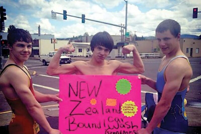 Wrestlers Jake Porter, left, and Jason Miller, right, lend a hand to Anthony Hardee, center, who was washing cars at O’Reilly Auto Parts last week in an effort to raise funds for a cultural exchange wrestling trip to New Zealand later this year. Hardee and Kobe Olson are planning to make the trip. For information, call (541) 570-2332.